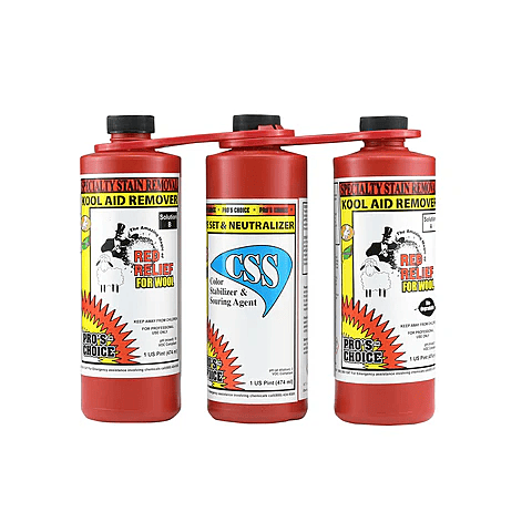 Thoroughly extraction-rinse the stained area. Follow with multiple vacuum only dry strokes to leave fibers as dry as possible. Mix the “Red Relief for Wool” using equal portions of solution “A” and “B”. Wet only the stained fibers with the Red Relief solution. Allow up to 10 minutes dwell time for the stain to disappear or change to a light yellow color. Thoroughly flush and extraction-rinse the stain and surrounding area. Follow with multiple vacuum only strokes to leave the fibers as dry as possible. If any stain remains repeat steps 2 through 5 (it may be necessary to repeat this procedure up to 4 times for severe stains). Neutralize the area by saturating it with a CSS solution (1 part CSS to 3 parts water). Allow 3-minute dwell time. Extraction-rinse and groom the fibers. Dry area as soon as possible.